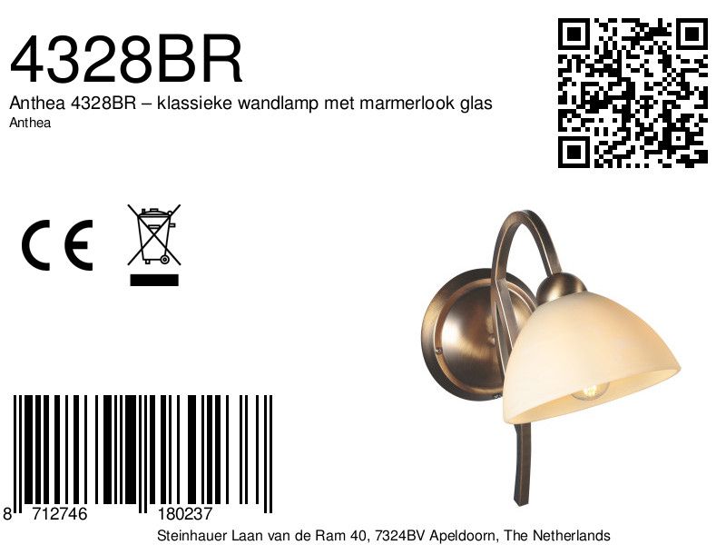De Anthea 4328BR is een charmante wandlamp met een klassieke uitstraling en een warme, sfeervolle lichtverspreiding. Het armatuur in bronskleur vormt een mooi geheel met de glazen kap in marmer crème look, die met zijn diameter van 17 cm zorgt voor een zachte en diffuse lichtbundel.