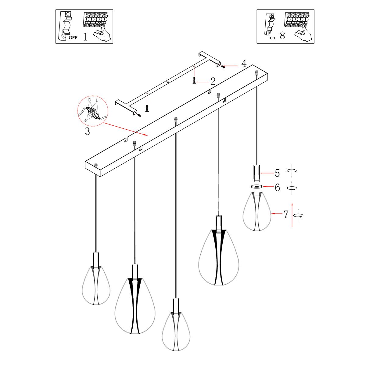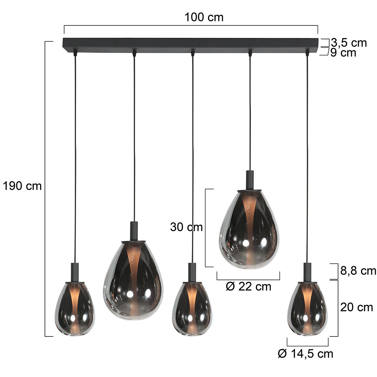 Individueel verstelbare hoogte – Pas de ophanghoogte van elk glas tijdens de montage aan tussen 30 en 170 cm, zodat de lamp optimaal in uw interieur past.