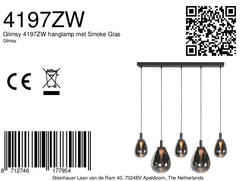 De Glimsy 4197ZW is een stijlvolle 5-lichts hanglamp die perfect past in een modern interieur. Met zijn strakke zwarte afwerking en een combinatie van twee verschillende formaten smoke glazen (twee grote en drie kleine) brengt deze lamp een speels en elegant effect in elke ruimte. De Glimsy 4197ZW is ideaal voor boven de eettafel, een kookeiland of in een sfeervolle zithoek.