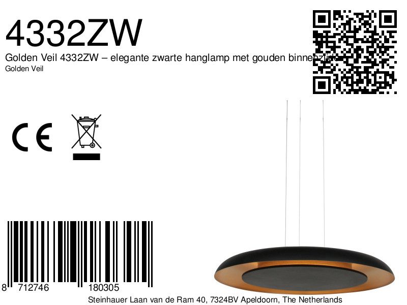 De Golden Veil 4332ZW is een verfijnde hanglamp met matzwarte buitenkant en warme gouden binnenzijde. Voorzien van ingebouwde LED-verlichting van 48 watt (2700K) met zowel direct als indirect licht. In hoogte verstelbaar tot 125 cm tijdens montage.