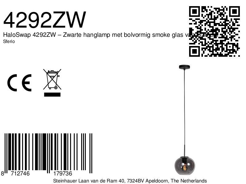 HaloSwap 4292ZW – Zwarte hanglamp met bolvormig smoke glas van Ø20 cm