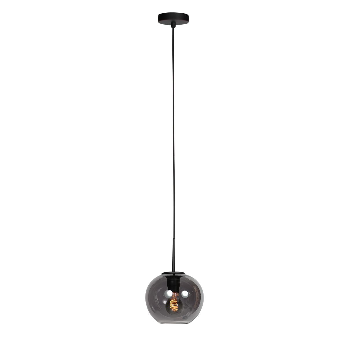 Deze uitvoering wordt geleverd met een bolvormige smoke kleurige glazen kap van Ø20 cm en een hoogte van 16,6 cm. De warme tint van het glas zorgt voor een aangename, sfeervolle lichtval – perfect boven een eettafel, kookeiland of bar.