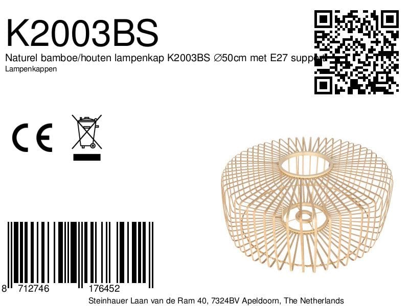 De K2003BS is voorzien van een support met een E27 fitting gat, waardoor hij eenvoudig te combineren is met verschillende soorten lampen. Of je nu een staande vloerlamp, een mooie hanglamp of een sfeervolle schemerlamp wilt verfraaien, deze lampenkap past perfect en voegt een vleugje verfijning toe aan elke ruimte.