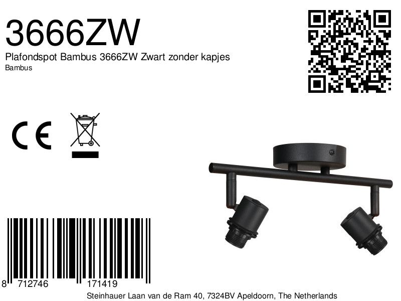 Ontdek de veelzijdigheid van de 2-lichts zwarte plafondspot 3666ZW uit de Bambus-serie. Deze lamp kan dienen als zowel wandlamp als plafondspot en voegt een vleugje stijl toe aan elke ruimte. Met 2 E14-fittingen. Standaard leveren wij dit model nu zonder kapjes! In het verleden zaten hier bamboe kapjes aan. Het kan tijdelijk nog voorkomen dat u er toch nog bamboe achtige kleine ton kapjes bij ontvangt. Deze ontvangt u gratis, mocht u ze niet gebruiken mag u deze weggooien.