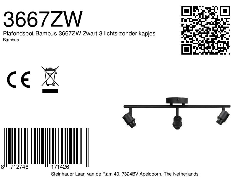 Ontdek de veelzijdigheid van de 3-lichts zwarte plafondspot 3667ZW uit onze Bambus-serie. Deze kan dienst doen als wandlamp of plafondspot en biedt een unieke uitstraling. Uitgerust met 3 E14 fittingen. Standaard leveren wij dit model nu zonder kapjes! In het verleden zaten hier bamboe kapjes aan. Het kan tijdelijk nog voorkomen dat u er toch nog bamboe achtige kleine ton kapjes bij ontvangt. Deze ontvangt u gratis, mocht u ze niet gebruiken mag u deze weggooien.