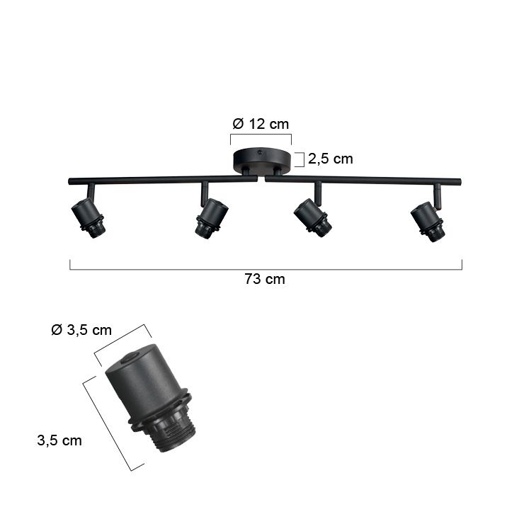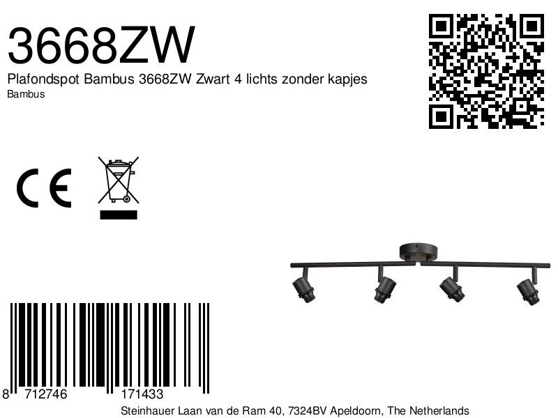 Ontdek de elegantie van de 4-lichts zwarte plafondspot 3668ZW uit onze Bambus-serie. Deze veelzijdige lamp kan dienen als wandlamp of plafondspot en is voorzien van 4 E14 fittingen. Standaard leveren wij dit model nu zonder kapjes! In het verleden zaten hier bamboe kapjes aan. Het kan tijdelijk nog voorkomen dat u er toch nog bamboe achtige kleine ton kapjes bij ontvangt. Deze ontvangt u gratis, mocht u ze niet gebruiken mag u deze weggooien.