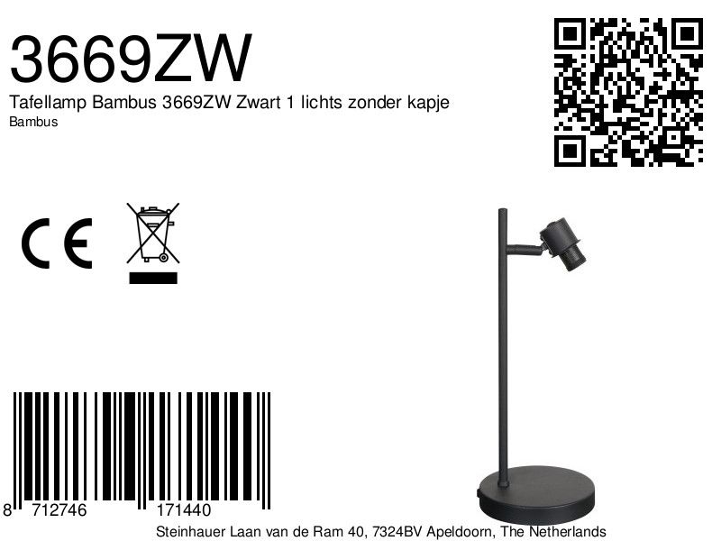 Ontdek de sfeer van de 1-lichts zwarte tafellamp 3669ZW uit onze Bambus-serie. Deze tafellamp, met 1 E14 fitting. Met een diameter van 19 cm en een hoogte van 39 cm voegt deze lamp een vleugje elegantie toe aan uw ruimte. Standaard leveren wij dit model nu zonder kapje! In het verleden zat hier een bamboe kapje aan. Het kan tijdelijk nog voorkomen dat u er toch nog bamboe achtige klein ton kapje bij ontvangt. Deze ontvangt u gratis, mocht u ze niet gebruiken, mag u deze weggooien.