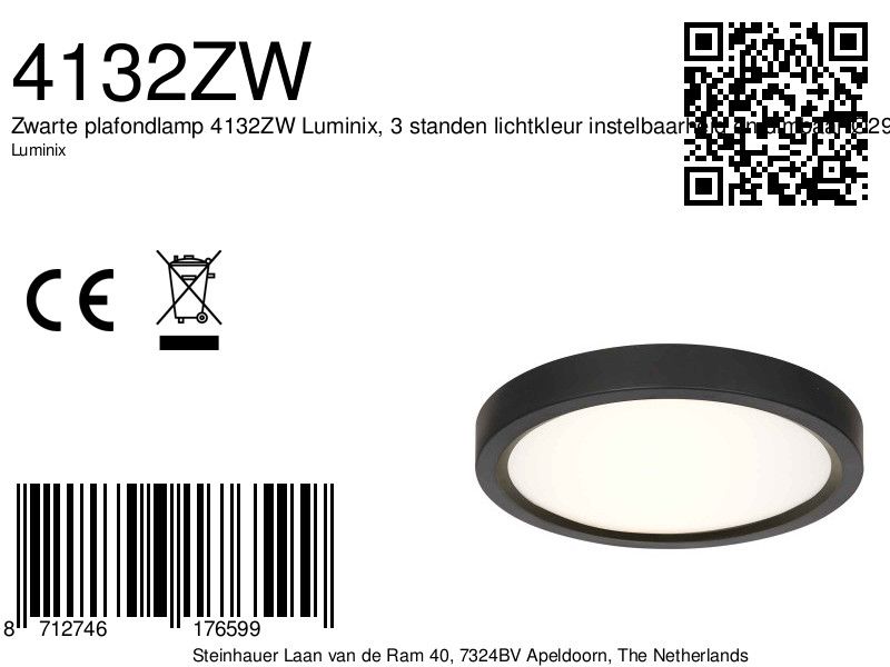 Zwarte plafondlamp 4132ZW Luminix, 3 standen lichtkleur instelbaarheid en dimbaar Ø29 cm