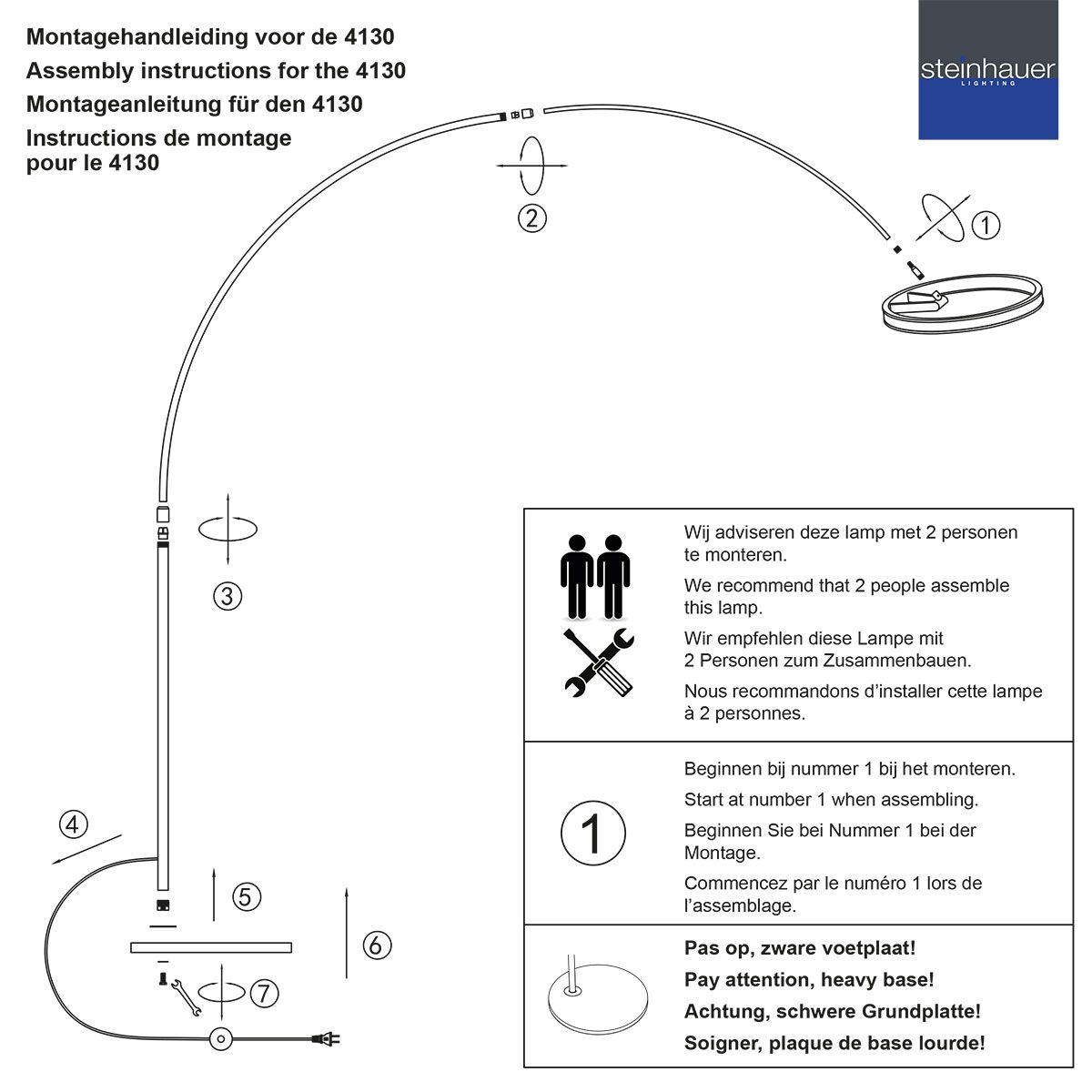 De 4130 is een erg grote lamp met een voetplaat van ruim 14 kilo. Wij adviseren om deze lamp met 2 man te monteren. De montage is eenvoudig maar moeilijk alleen te doen. De montage volgorde is ook belangrijk (zie tekening), begin bij punt 1 en eindig bij punt 7!