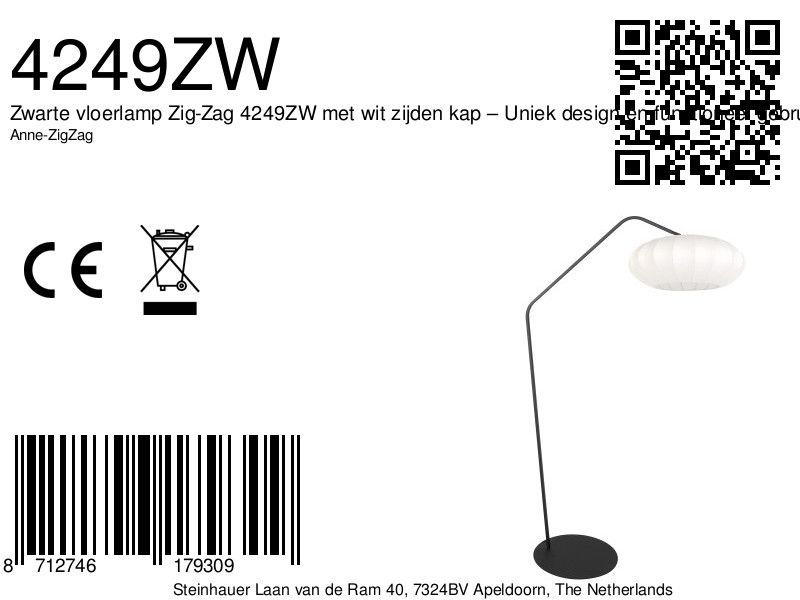 Zwarte vloerlamp Zig-Zag 4249ZW met wit zijden kap – Uniek design en functioneel gebruik