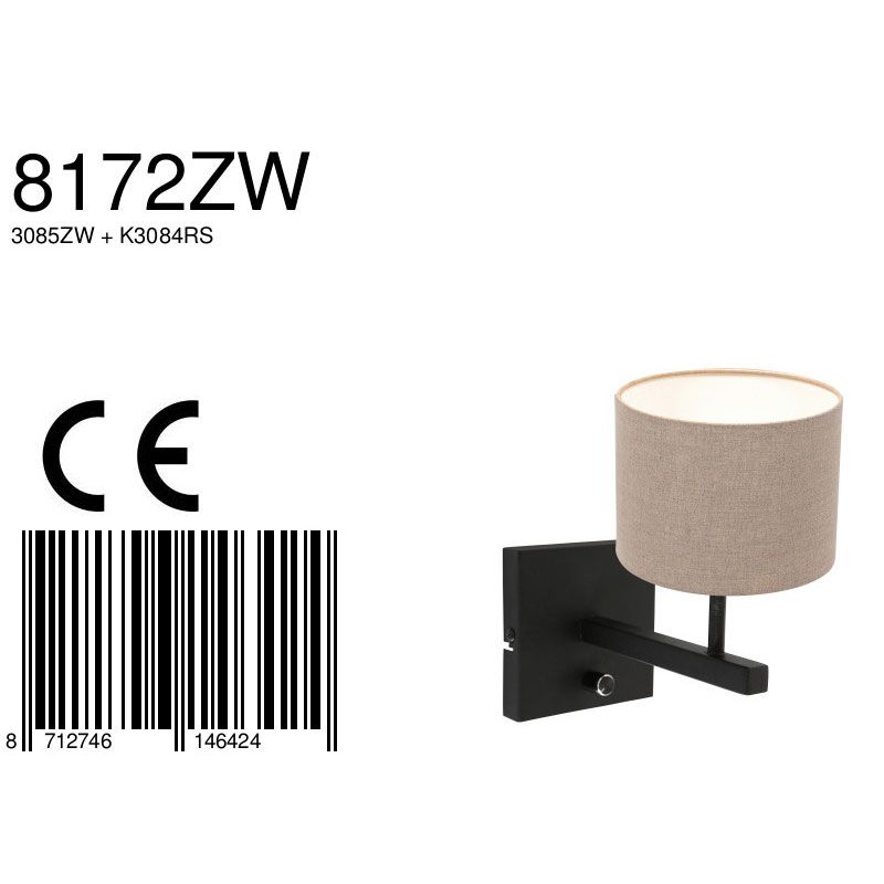 Zwarte wandlamp Stang 8172ZW met schakelaar en grijs linnen kap