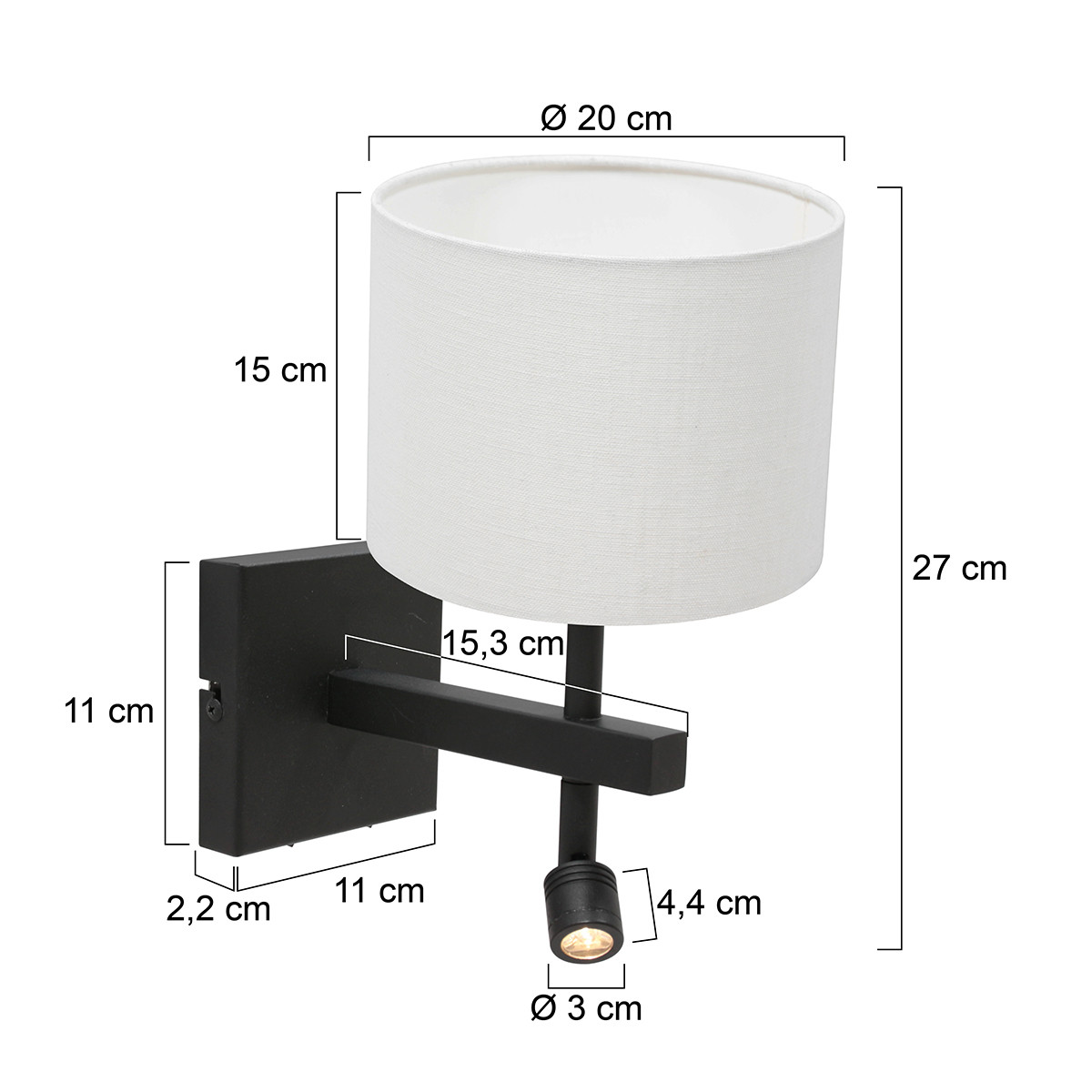 Zwarte wandlamp Stang 8204ZW met leeslamp en wit grof linnen kap